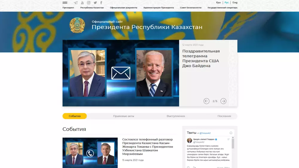 На главной странице сайта размещены ссылки на официальный аккаунт Главы государства Касым-Жомарта Токаева в социальной сети Twitter, а также на страницу пресс-службы Президента в сети Facebook.