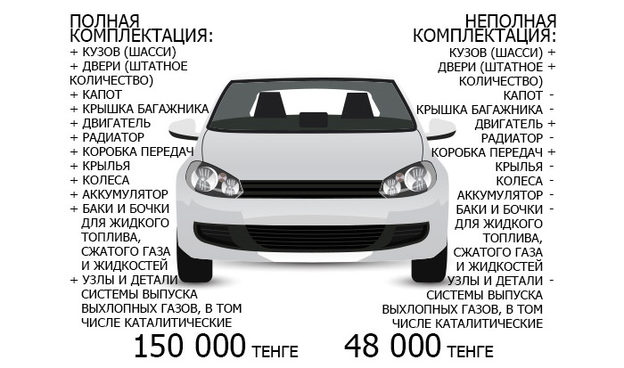 В программе могут участвовать автомобили категории М1. Это легковые автомобили массой не более 3,5 тонны или имеющие не более семи посадочных мест. Ограничений по году выпуска и сроку владения автотранспортным средством нет. Авто может быть как на ходу, так и нет. Аварийные автомобили допускаются к участию в программе утилизации при наличии необходимой комплектации и возможности ее определения. Владелец вышедшего из эксплуатации автомобиля с полной комплектацией может рассчитывать на полную сумму компенсации в 150 тысяч тенге. За авто с неполной комплектацией - 48 тысяч тенге.