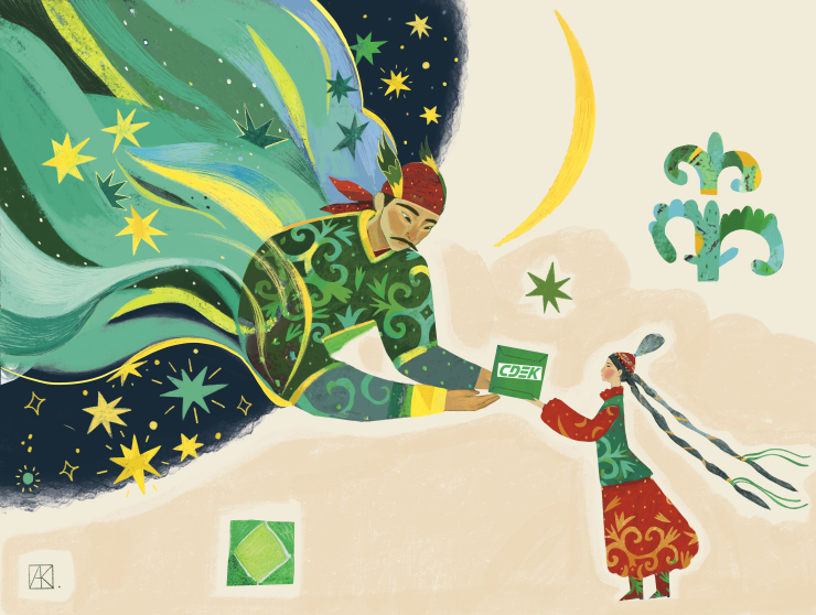 В своей работе Айгерим использовала метафоры из казахских сказок и традиционные орнаменты, которые являются знаками культуры. В иллюстрациях также присутствуют определенные образы: девушка в национальной одежде и батыр, лошади и юрты, глубоко укорененные в казахской визуальной идентичности.