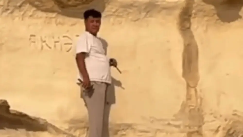 Напомним, что акт вандализма с участием Манаса Кошербаева засняли в живописном каньоне Ыбыкты-Сай в августе 2023 года. Мужчина при помощи молотка и отвертки выбивал буквы на известняковой стене живописного каньона.
