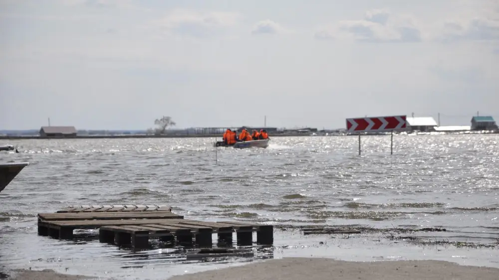 Прямо на дороге организована переправа. Сотрудники областного департамента по ЧС на моторных лодках перевозят жителей Прибрежного из села и обратно в село.