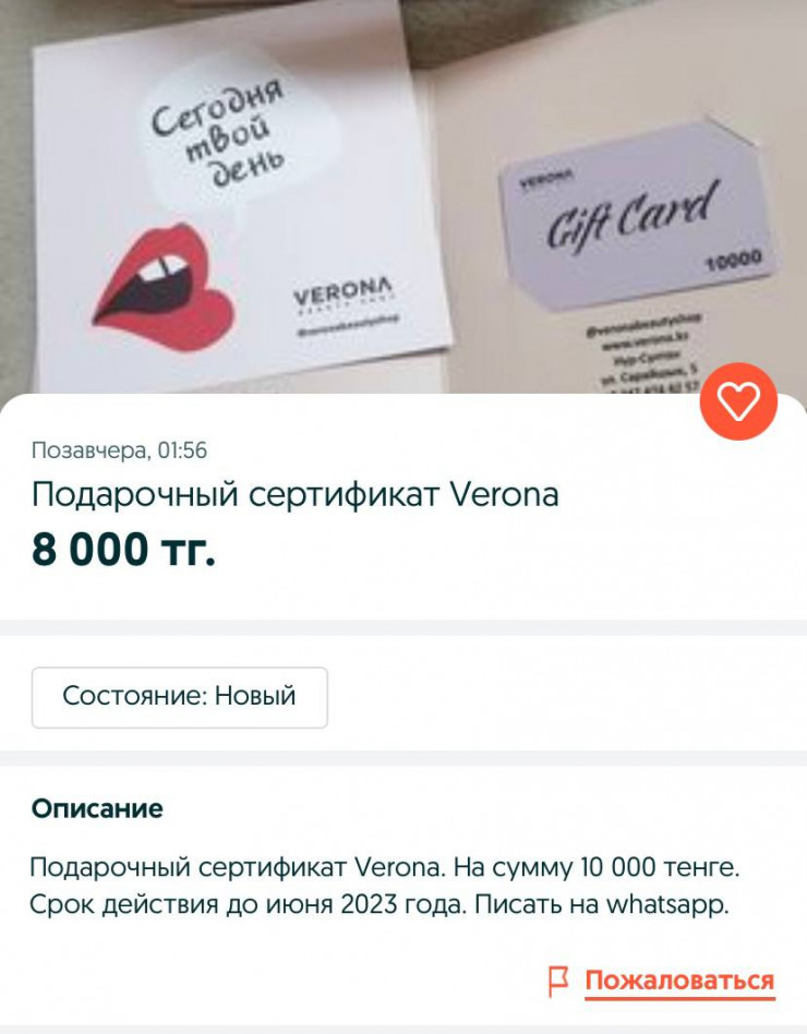 Авторы объявлений предлагают приобрести сертификат по заниженным ценам. К примеру, сертификат стоимостью 10 тысяч тенге счастливая обладательница предлагает приобрести за 8 тысяч.
