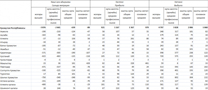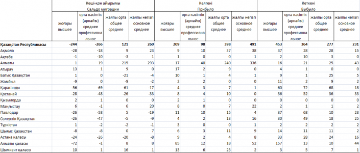 В разрезе имеющегося образования из 15 399 уехавших в страны СНГ казахстанцев старше 16 лет у 4 797 есть высшее образование, 3 828 человек имеют среднее профессиональное образование, 2 006 человек - общее среднее образование, 1 068 - основное среднее образование.