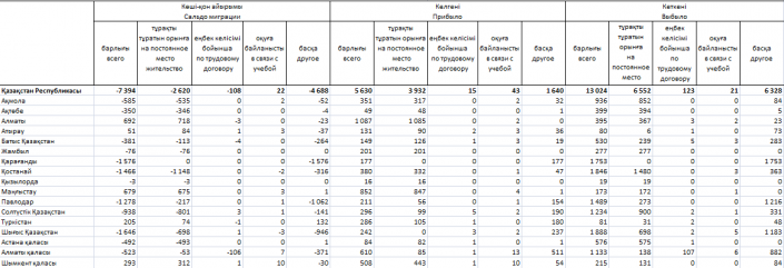 Из 13 024 взрослых старше 16 лет,  покинувших Казахстан, на постоянное место жительство уехали 6 552 человека, 123 - по трудовому договору, 21 человек - в связи с учебой, другое - 326.