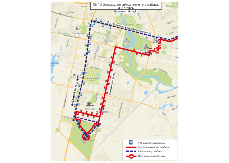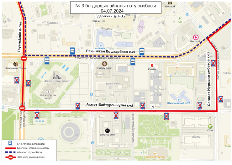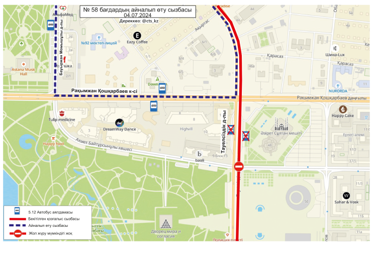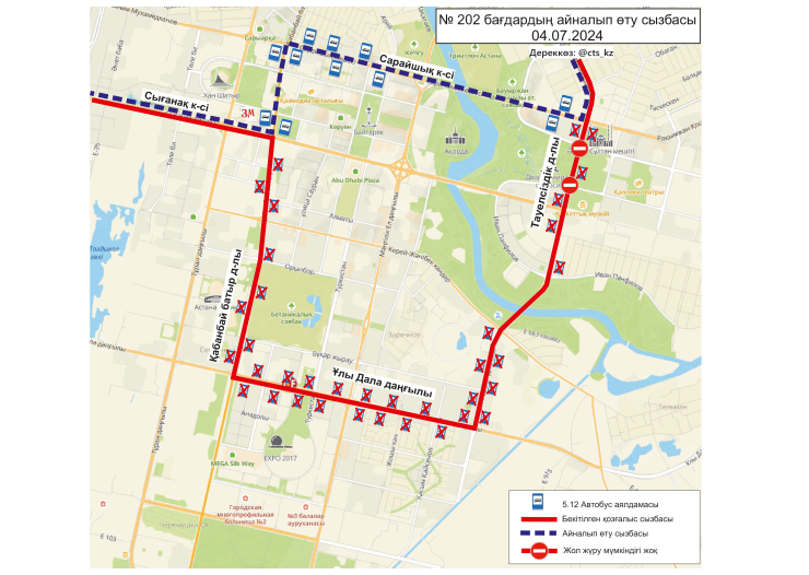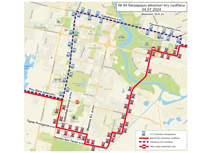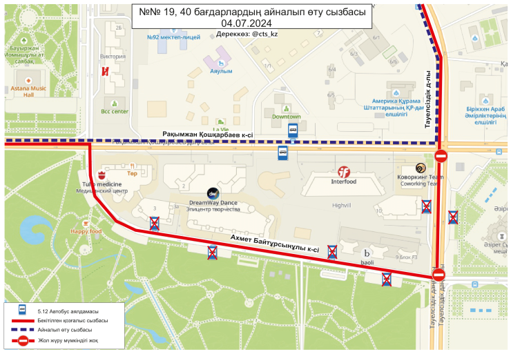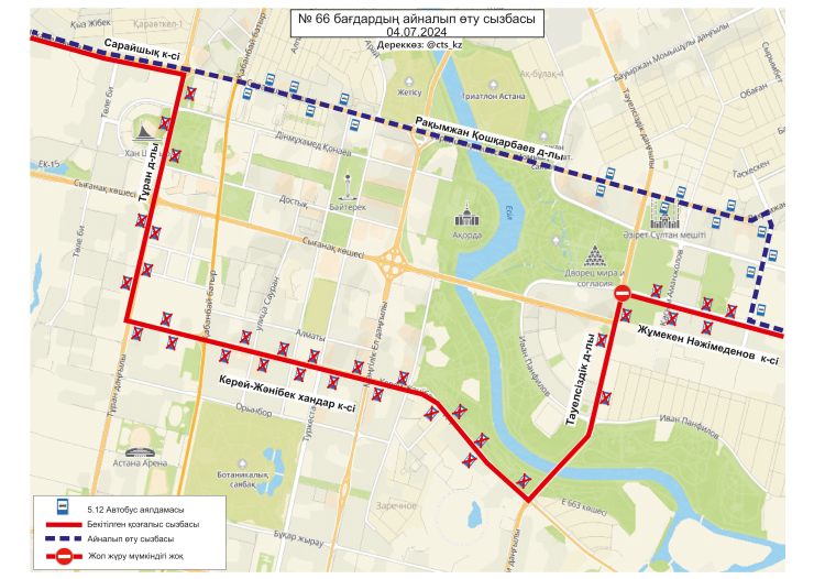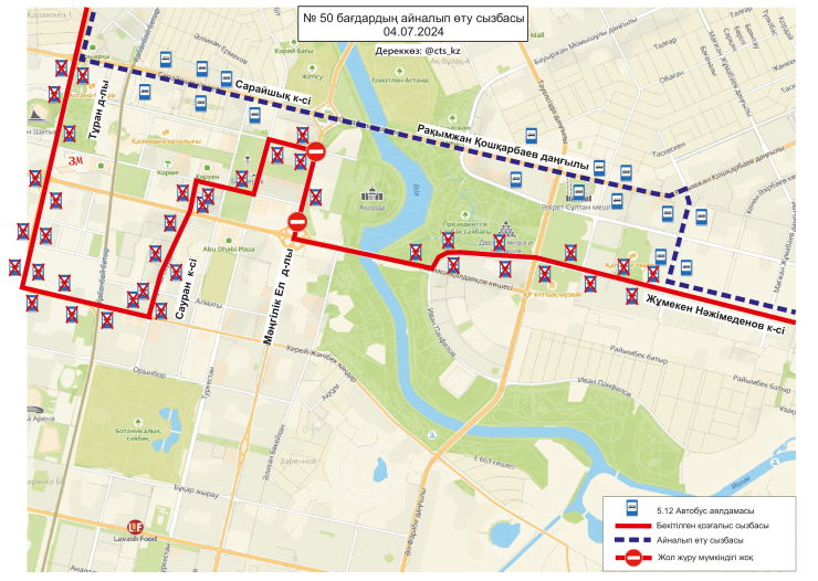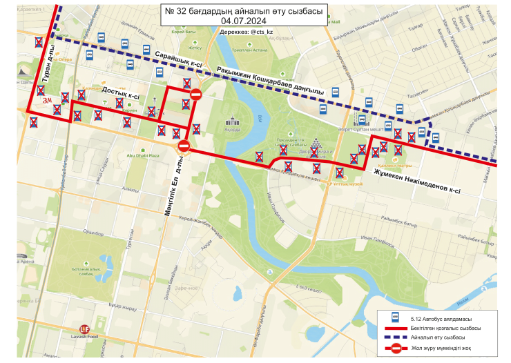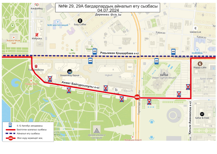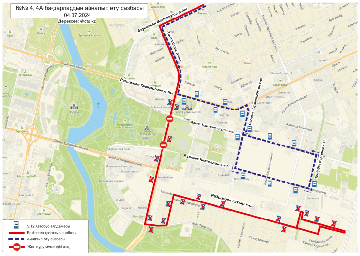 По официальным данным, 4 июля временно меняются схемы маршрутов №№ 3, 4, 4А, 14, 19, 21, 29, 29А, 32, 40, 43, 50, 58, 66, 84, 202, 203. Изменение связано с ограничением движения транспорта по проспекту Тәуелсіздік.