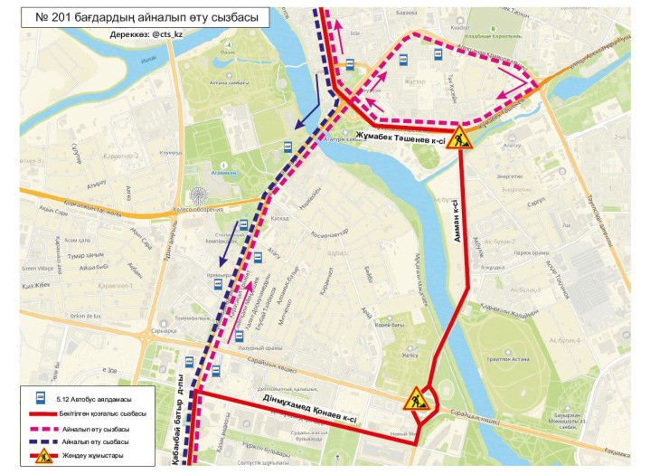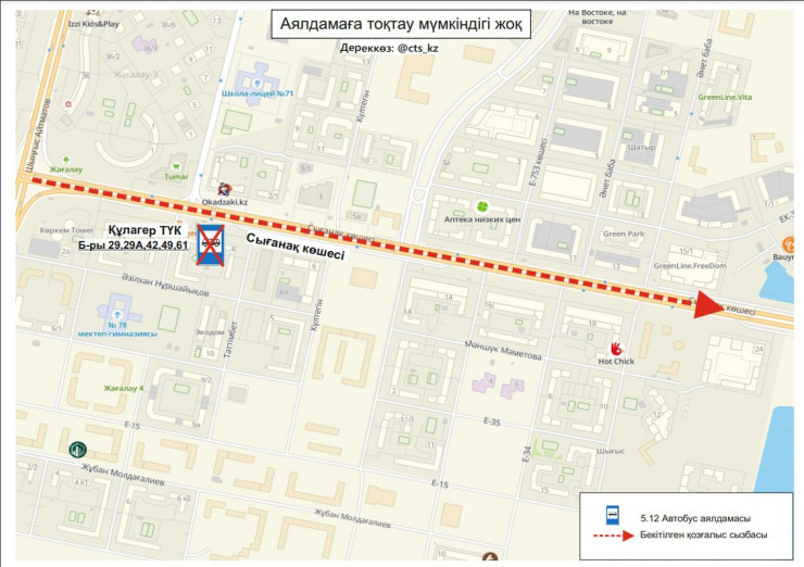 В СTS также сообщили о том, что перекрыт проезд к остановочному пункту "ЖК Кулагер" по улице Сыганак.