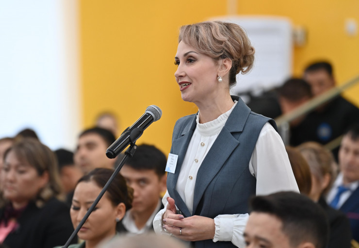От имени педагогической общественности Павлодарской области выступили учитель русского языка и литература средней школы-лицея № 8 Ирина Шевченко и учитель музыки средней школы имени Музафара Алимбаева Бахатхан Оразбек.