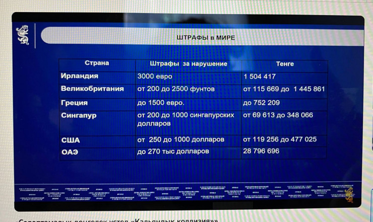 "Давайте посмотрим, какие примеры штрафов в дальнем зарубежье. У меня есть данные, например, в Ирландии: штрафы за нарушение антитабачного законодательства составляют 3 тысячи евро, это 1 миллион 504 тысячи тенге. Великобритания - от 200 до 2500 футов - нашими 1 миллион 446 тысяч тенге. Греция - 1500 евро, или 752 тысячи тенге. В США - от 250 до 1000 долларов, или в тенге - 477 тысяч. В АОЭ - до 270 тысяч долларов или 28 миллионов 796 тысяч тенге.