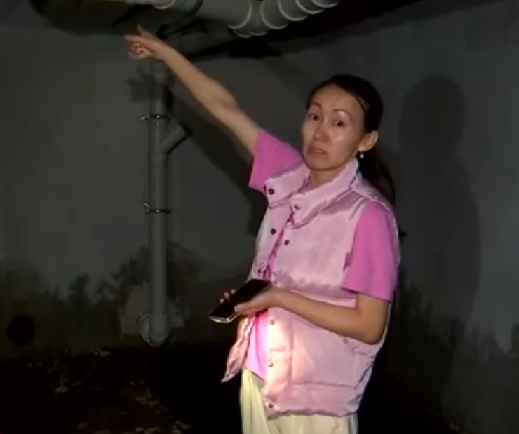 "Когда люди нажимают слив на унитазе, то из каждой дырки капает: то с потолка, то со стен. Тут должна стоять канализационная труба, они поставили сотку. Поэтому вода не успевает уходить, и она вытекает из всех трещин. Каждые два дня мы ее прочищаем", - говорит жительница дома.