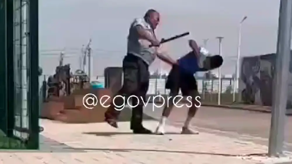На кадрах видно, как похожий на охранника или полицейского мужчина держит молодого человека, ругает и замахивается дубиной, затем пару раз бьет в живот. Подросток в это время кричит: "Агай, простите меня! Ой бай! Простите, пожалуйста!"
