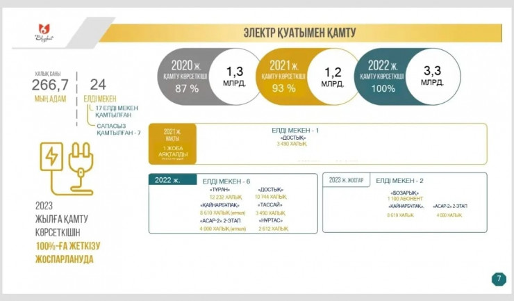 По информации Мулкеманова, до конца года строительные работы по обеспечению электроэнергией микрорайонов Достык, Кайнар-булак, Асар-2, Тассай, Туран, Нуртас будут завершены, а к 2023 году начнется строительство электросетей в жилых массивах Бозарык, Кайнар-булак и Асар-2 (2-й этап).