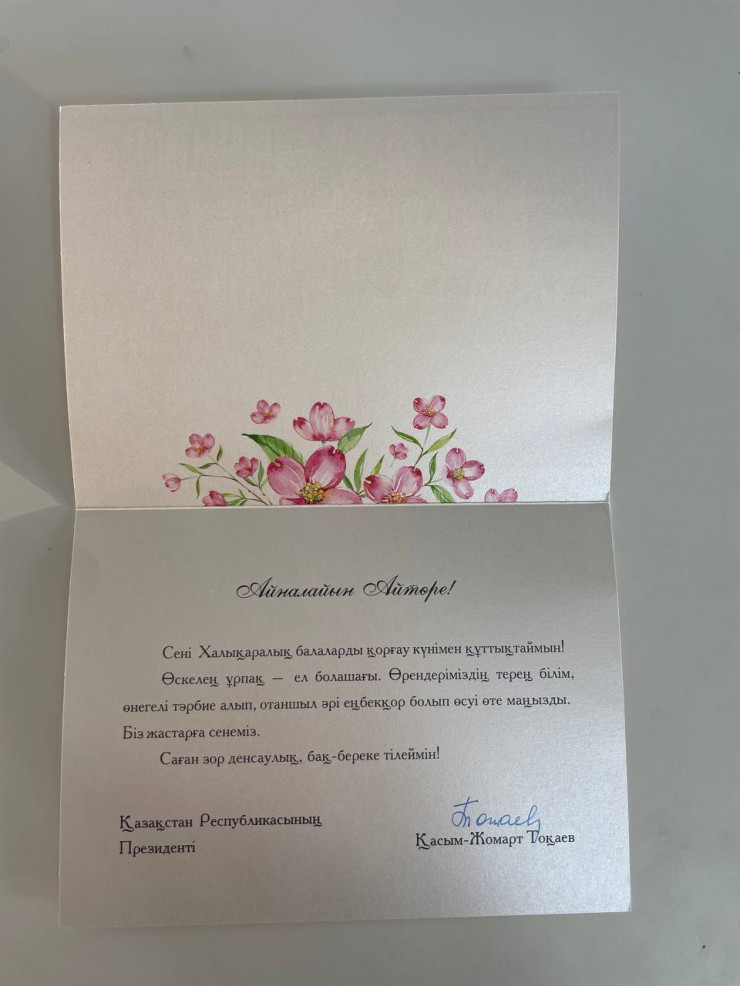 "Айналайын Айторе! Поздравляю тебя с Международным днем защиты детей! Подрастающее поколение - будущее страны. Очень важно, чтобы наши дети получили качественное образование, нравственное воспитание, выросли патриотичными и трудолюбивыми. Мы верим в молодежь. Желаю тебе крепкого здоровья и процветания", - говорится в тексте поздравительной открытки от Главы государства.