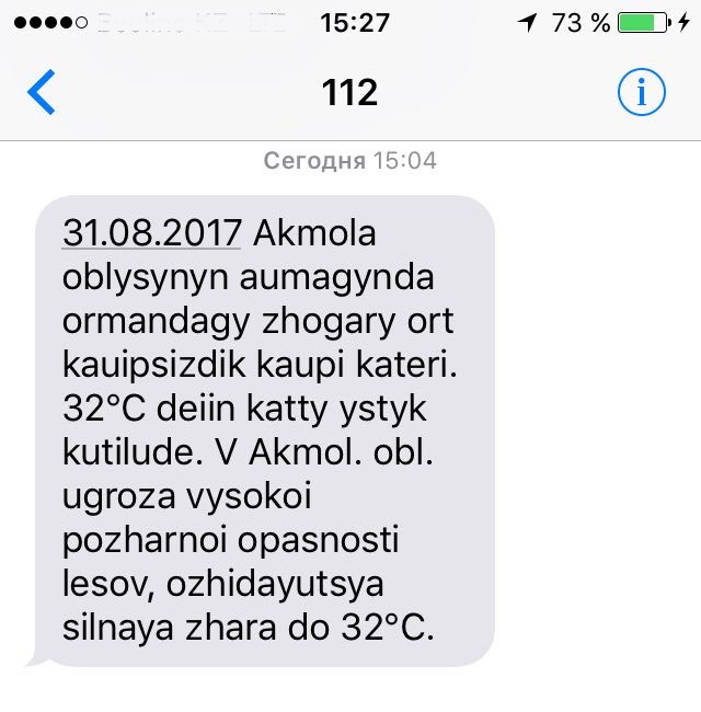 Также жителям Акмолинской области пришли sms-сообщения о том, что в регионе наблюдается угроза высокой пожарной опасности лесов, а также ожидается жара до 32 градусов.