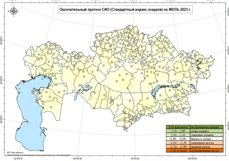 "Сильная засуха возможна в Кармакшинском районе Кызылординской области и в Амангельдинском районе Костанайской области. Умеренная влажно прогнозируется в Есильском районе Северо-Казахстанской области, в Петропавловске и в Казталовском районе Западно-Казахстанской области", - говорится в сообщении.
