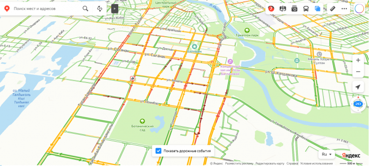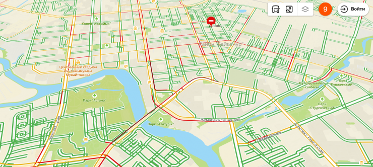 По данным навигатора 2GIS, заторы достигли 9 баллов. Но в основном скопления машин наблюдаются только на центральных улицах и проспектах.