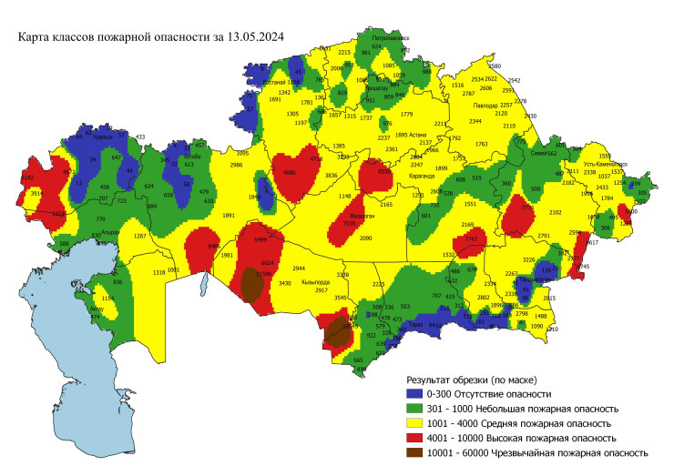 На западе, юге Карагандинской, в центре области Улытау, на юге области Абай, Костанайской области, на северо-западе Атырауской, на юго-востоке Восточно-Казахстанской, на западе Кызылординской области сохраняется высокая пожарная опасность, на западе, северо-западе, юго-западе Западно-Казахстанской области ожидается высокая пожарная опасность.