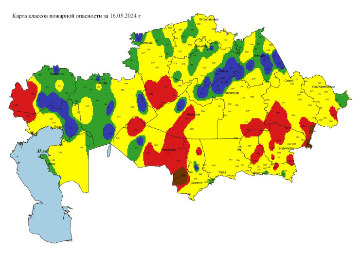 На юге Карагандинской, в центре области Улытау, на юге области Абай, Костанайской области, на северо-западе Атырауской, на юго-востоке Восточно-Казахстанской, на севере, востоке, в центре Кызылординской, на западе, юго-западе Западно-Казахстанской области, на востоке области Жетысу сохраняется высокая пожарная опасность.