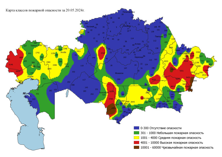На юге Карагандинской, на северо-западе Атырауской, на востоке Кызылординской, на западе, юго-западе Западно-Казахстанской, на северо-западе, юго-востоке Восточно-Казахстанской области, в центре области Абай сохраняется высокая пожарная опасность, на юге Костанайской области ожидается высокая пожарная опасность.