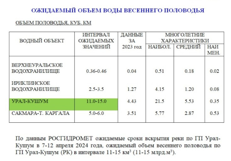 "Ожидается, что объем весеннего половодья на участке Урал-Кушум составит от 11,0 до 15,0 кубического километра, что значительно превышает показатели прошлого года и приближается к рекордным значениям", - добавили в Казгидромете.