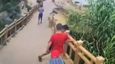 На кадрах запечатлена группа подростков, которые выламывают перила ногами на Скальной тропе.