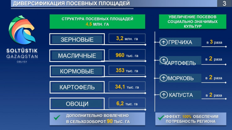 В сфере сельского хозяйства валовой выпуск продукции за 5 месяцев составил 101 миллиард тенге с ростом на 103,6 процента. Посевы культур увеличились на 90 тысяч гектаров и достигли 4,5 миллиона гектаров. Площади гречихи выросли в 3 раза, картофеля, моркови и капусты - в 2 раза.