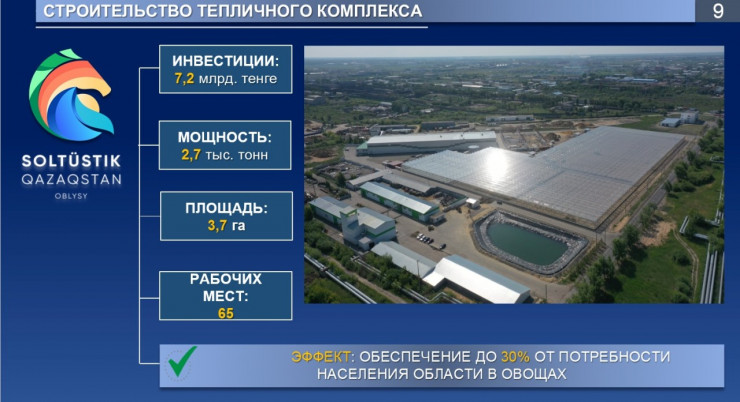 Всего в сфере агропромышленного комплекса начата реализация 31 проекта на 77,5 миллиарда тенге. Это птицефабрики, овцефермы, овощехранилище, теплицы, орошение и маслоэкстракционный завод.