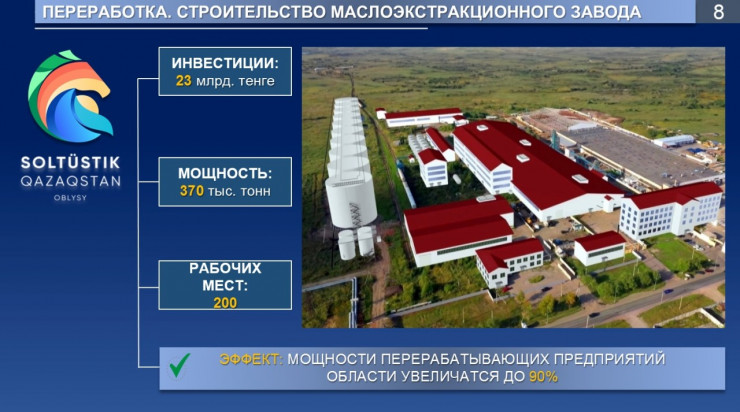 Молочный завод планирует увеличить производство сыра до 6 тысяч тонн и наладить выпуск сгущенного молока. На 23 миллиарда тенге строят маслоэкстракционный завод. Предприятие будет перерабатывать масличные и производить высокопротеиновые кормовые добавки: жмых и шрот. Будет открыто 200 новых рабочих мест.