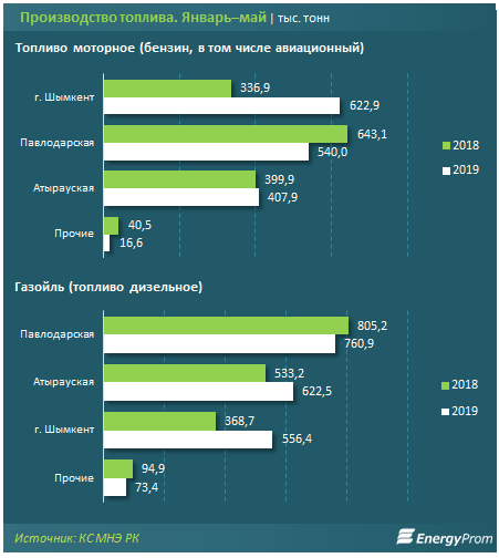 Больше всего производства бензина пришлось на Шымкент (Шымкентский нефтеперерабатывающий завод "ПетроКазахстан Ойл Продактс", ПКОП) - 622,9 тысячи тонн, Павлодарскую область (Павлодарский нефтехимический завод, ПНХЗ) - 540 тысяч тонн, Атыраускую область (Атырауский нефтеперерабатывающий завод, АНПЗ) - 407,9 тысячи тонн.