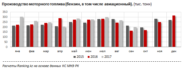 Однако текущего ускорения производства недостаточно, чтобы удовлетворить спрос на топливо со стороны казахстанских автолюбителей в полной мере. За январь-август 2017 года на внутреннем рынке было реализовано 2,8 миллиона тонн моторного бензина, или на 47,5 тысячи тонн больше, чем за аналогичный период 2016 года. В прошлом году (январь-август) годовой прирост потребления бензина составил всего 3,1 тысячи тонн.