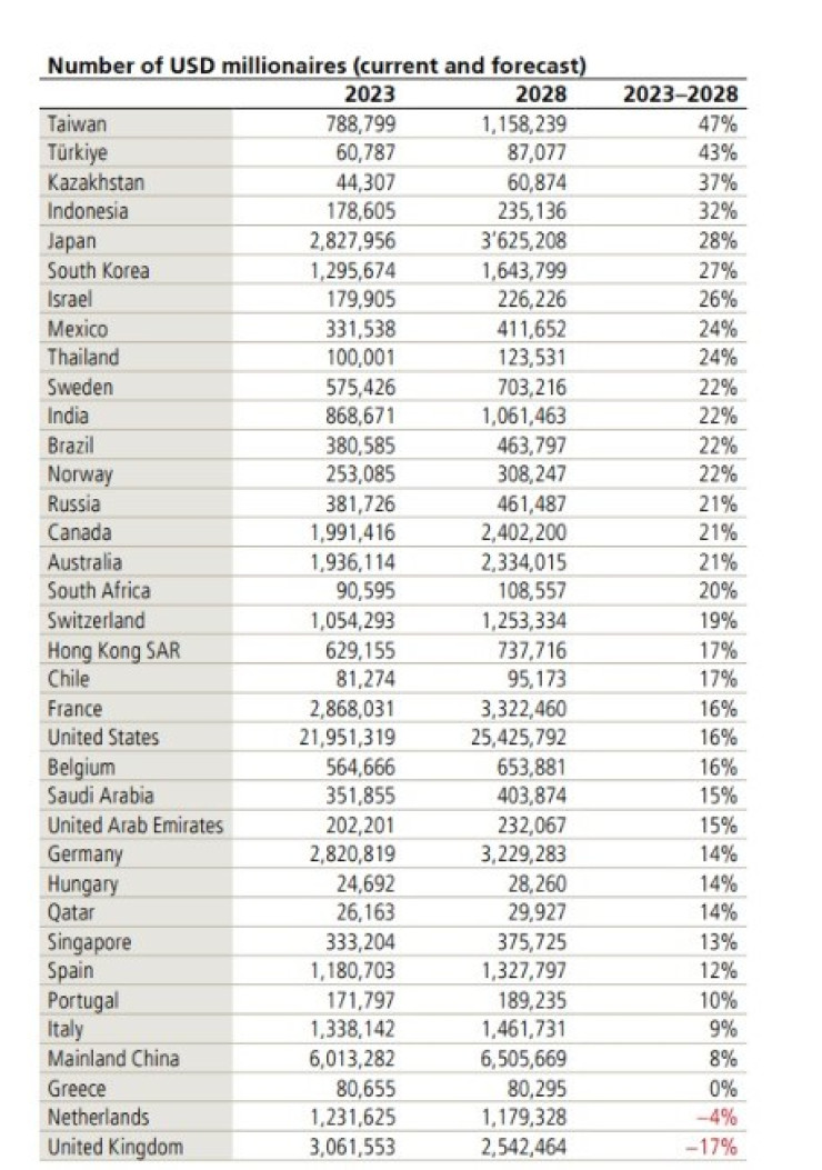 "Мы ожидаем, что к 2028 году число взрослых с богатством более миллиона долларов США вырастет в 52 из 56 стран в нашей выборке. Например, в Японии и Корее число долларовых миллионеров увеличится на 25 процентов, а в Тайване - более чем на 50 процентов, в основном из-за миграции богатых иностранцев", - говорится в отчете.