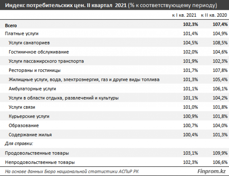 Аналитики отметили, что платные услуги вносят наименьший вклад в инфляцию. Цены на потребительском рынке Казахстана во втором квартале текущего года выросли на 2,3 процента относительно первого квартала и на 7,4 процента - относительно второго квартала годом ранее. В то же время стоимость платных услуг выросла лишь на 1,4 процента за квартал и на 4,9 процента за год.