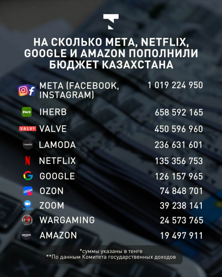 К примеру, компания Meta уплатила за два квартала 2022 года 1 миллиард 19 миллионов 224 тысячи тенге.