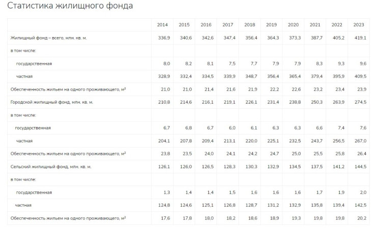 "Обеспеченность жильем на одного проживающего, которая определяется как отношение общей площади по жилым помещениям (квартирам) к численности лиц, за 2023 год составила 23,9 квадратного метра, годом ранее она составляла 23,5 квадратного метра", - говорится в сообщении.