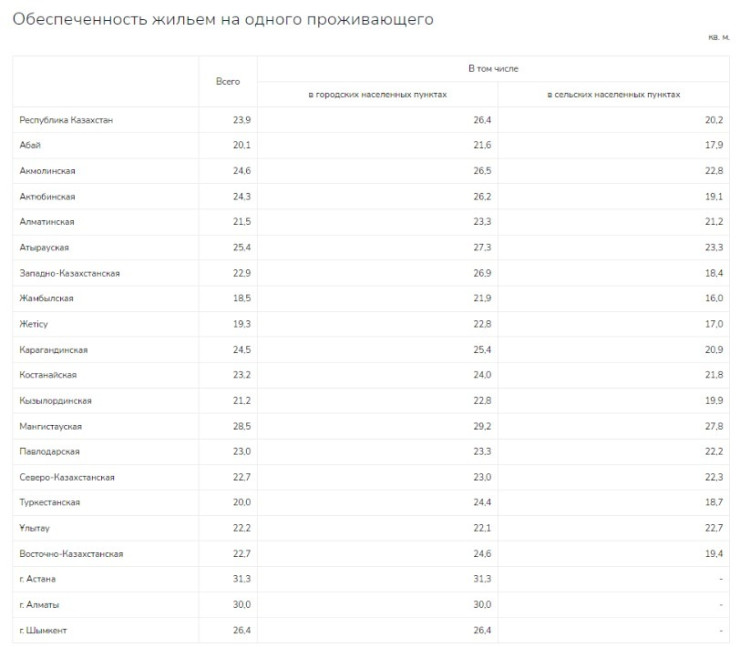 Самые высокие показатели обеспеченности жильем в Астане - 31,3 квадратного метра на человека. Второе место у жителей Алматы - 30 квадратных метров. Замыкает тройку лидеров Мангистауская область, где каждый житель обеспечен в среднем 28,5 квадратного метра жилья.