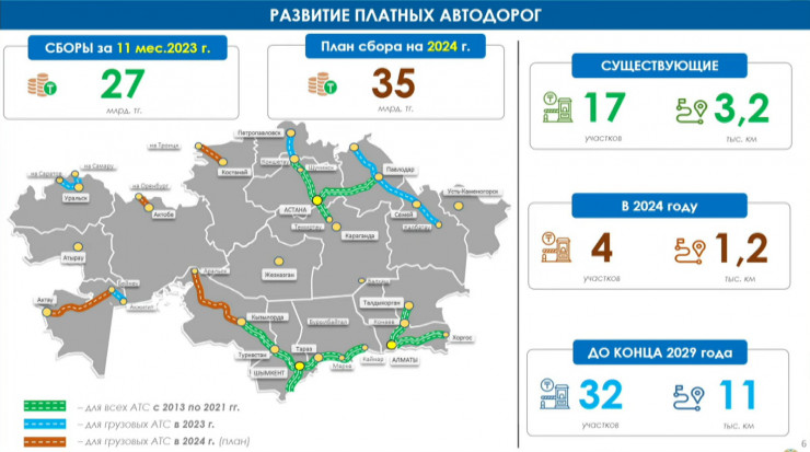 По данным представленной министром инфографики, в 2024 году в стране откроются еще четыре платных участка и планируется, что казахстанцы отдадут за проезд по платным дорогам уже 35 миллиардов тенге.