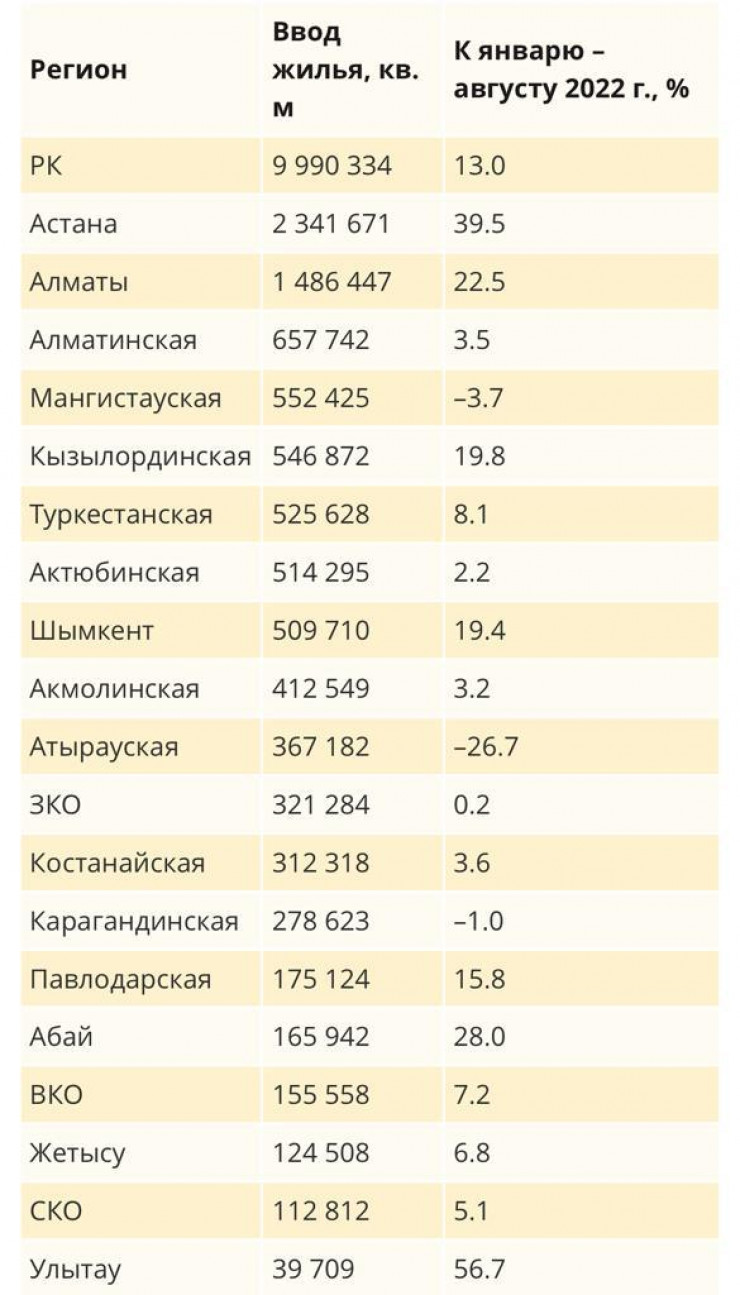 С января по август в Казахстане закончили строительство и ввели в законном порядке почти 10 миллионов квадратных метров жилья. Это на 13 процентов больше, чем за аналогичный период 2022 года. Положительная динамика отмечена в 17 из 20 регионов, передает Tengrinews.kz со ссылкой на krisha.kz.