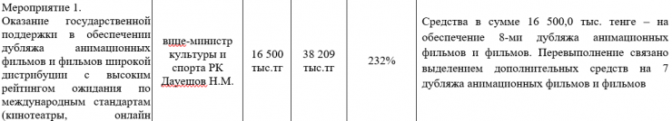 Мы нашли в открытом доступе отчет Министерства информации и общественного развития (МИОР) за 2021 год по реализации национального проекта "Ұлтттық рухани жаңғыру". Согласно документу, внушительных успехов удалось добиться, работая над популяризацией отечественного культурного продукта. К примеру, показатель количества поддержанных творческих проектов составил 170 процентов к плану. Но и это далеко не рекорд. Государственная поддержка в обеспечении дубляжа анимационных фильмов и фильмов широкой дистрибуции с высоким рейтингом ожидания по международным стандартам была оказана на 232 процента!