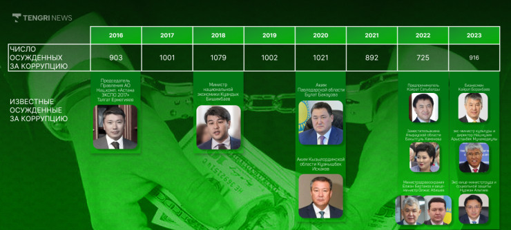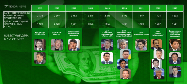 Отметим, что прошедшие 8 лет связаны с широко известными и яркими "коррупционными кейсами". Так, 2015-й запомнился делами о строителях объектов выставки "ЭКСПО-2017", по которому были задержаны руководитель компании, ответственной за выставку, Талгат Ермегияев и его руководитель по строительству Кажимурат Усенов. В 2016 году бывший президент МЦПС "Хоргос" Василий Ни был арестован при получении взятки в 1 миллион долларов с поличным, однако позже его освободили от уголовной ответственности. 2017 год запомнился всем громким делом министра национальной экономики Куандыка Бишимбаева.