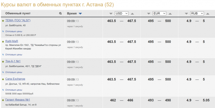 По данным Kurs.kz, в обменниках Астаны средний курс продажи доллара составил 467,5 тенге, покупки - 463,5 тенге. Евро продают по 500 тенге, покупают по 495 тенге. Рубль продают по 5 тенге, покупают по 4,9 тенге.