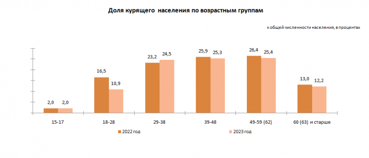 В 2023 году по сравнению с 2022 годом доля курящих респондентов увеличилась в возрастных группах 29-38 лет, в остальных возрастных группах - снизилась.