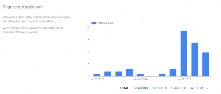 Всего с 2011 по 2016 год зарегистрировано 56 обращений из Казахстана об удалении 960 публикаций сервисов компании. Почти все запросы были отправлены должностными лицами и только один - судом (в 2016 году).