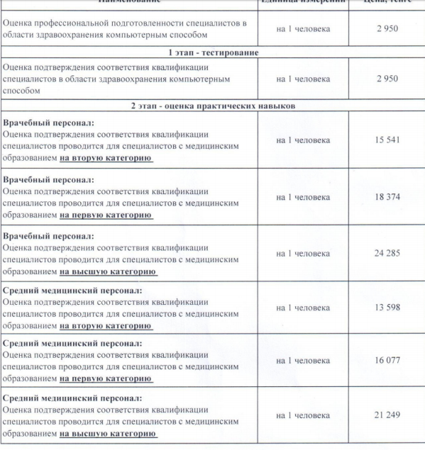 По информации руководителя Республиканского центра оценки знаний и навыков (далее - РЦОЗН), входящего в состав Республиканского центра развития здравоохранения МЗСР РК, Гульмиры Жангеревой, с 1 января 2016 года цена услуги по независимой оценке знаний и навыков медработников установлена в размере 2950 тенге.