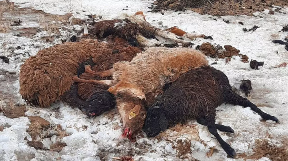 В Кызылкогинском районе в крестьянском хозяйстве "Ойтаң" от неизвестной болезни пало более 200 овец и 10 голов КРС. На видео, которое снял представитель крестьянского хозяйства (КХ) Айбар Ерекешов, запечатлено несколько мертвых животных.