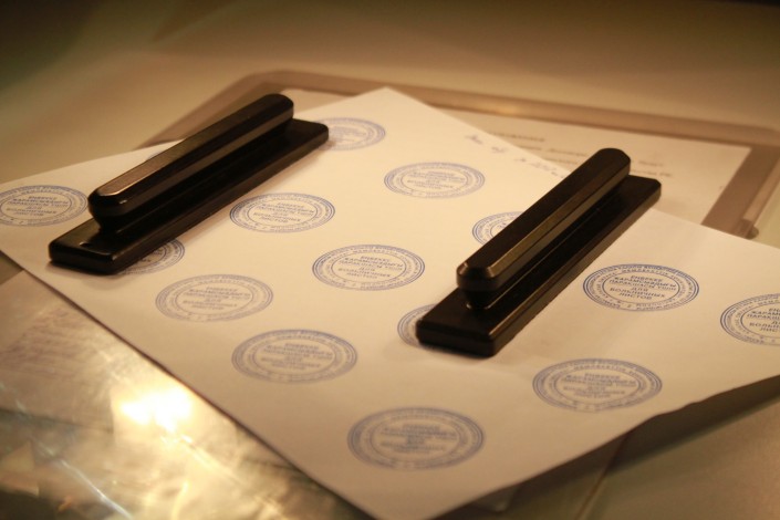 Демонстрируя работу своего оборудования, эксперт сравнивает печати на больничных листах.