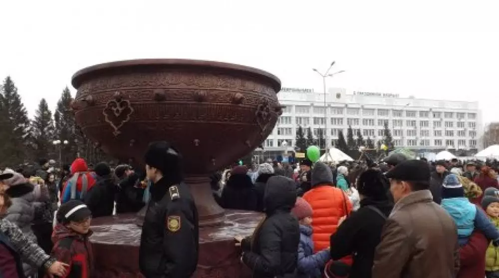 На создание 200-килограммового тайказана в Семее акимат потратил почти 5 миллионов тенге, передает Tengrinews.kz со ссылкой на информационный центр Восточно-Казахстанской области. Тайказан, который должен был стать символом праздника Наурыз в Семее, практически рассыпался на части из-за пристального внимания горожан. "Тайказан, который в дни праздников в Семее назвали символом Наурыза, и на изготовление которого из бюджета города потратили более 4,9 миллиона тенге, уже нуждается в реставрации. С казана сняты витиеватые ручки, порвана пленка с принтером под цвет оригинала в Туркестане, которой был обтянут сосуд, и начал разрушаться постамент", - говорится в распространенном сообщении. Восстанавливать утрату и постамент будет фирма-изготовитель. "Новый будет прочнее и выше", - отмечают в отделе архитектуры региона. Напомним, тайказан был изготовлен в Астане, над ним работали несколько скульпторов. Орнаменты были скопированы один в один с оригинала, который установлен в Туркестане. Скульптура сделана из современного стеклопластика, его высота один метр 50 сантиметров, диаметр составляет два метра 50 сантиметров, весит конструкция свыше 200 килограммов.