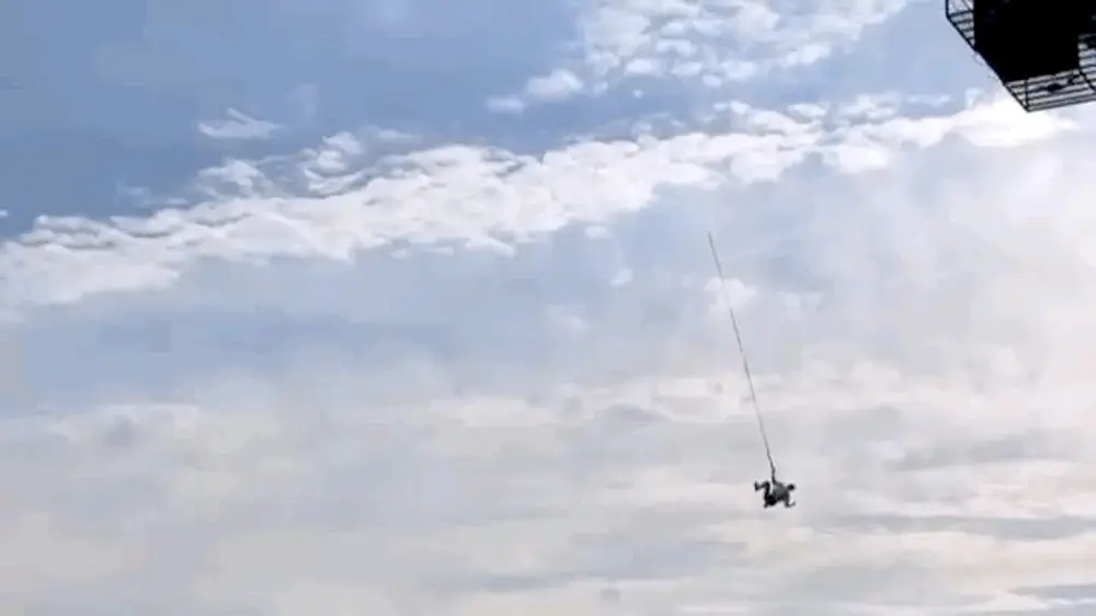 Администрация парка поделилась полным видео произошедшего, которое снял сам клиент. На нем герой запечатлен уже после того, как его спустили на землю. Судя по кадрам, мужчине удалось избежать серьезных травм, но он показывает на руку, которую "чуть не оторвало", и, вероятно, имеет место вывих. Также на руке и ноге заметны ссадины. При этом он сообщает, что не прочь прыгнуть еще раз.