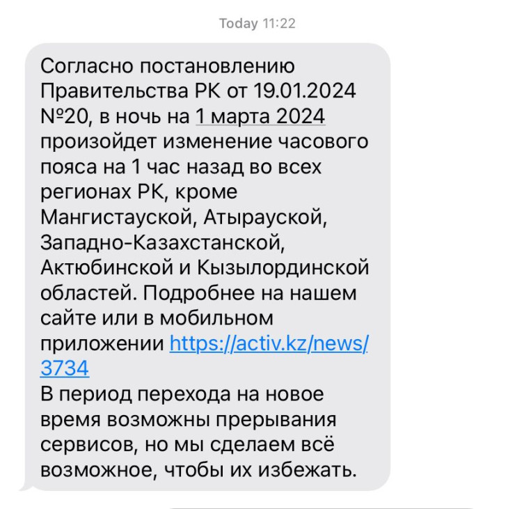 Абоненты Activ/Kcell получили SMS-сообщения о возможных технических сбоях из-за перевода часов в ночь на 1 марта в Казахстане.