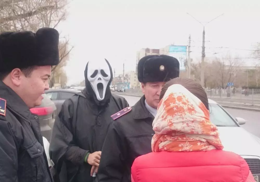 "Сегодня вместо административного протокола нарушителей правил дорожного движения встречали переодетые в костюмы "смерти" (черные балахоны с масками "Призрачного лица" из кинофильма "Крик" - Прим. автора) представители молодежного крыла "Жас Отан", которые с устрашающим видом раздавали нарушителям памятки о строгом соблюдении правил дорожного движения", - говорится в распространенном сообщении.