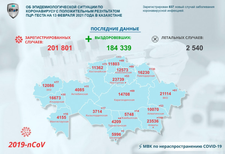 За прошедшие сутки (данные на 13 февраля) в Казахстане зарегистрированы 837 новых случаев заболевания коронавирусной инфекцией, передает Tengrinews.kz со ссылкой на МВК по нераспространению COVID-19.