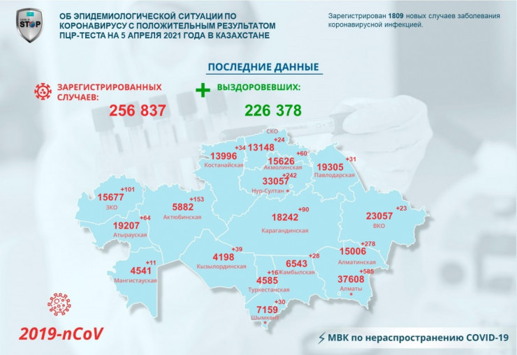За прошедшие сутки (по данным на 5 апреля) в Казахстане зарегистрировано 1809 новых случаев заболевания коронавирусной инфекцией, передает Tengrinews.kz со ссылкой на данные МВК по нераспространению COVID-19.